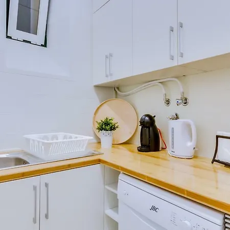 Cozinha totalmente equipada deste apartamento tem forno e máquina de lavar loiça. Este apartamento está situado a poucos quarteirões da Rossio.